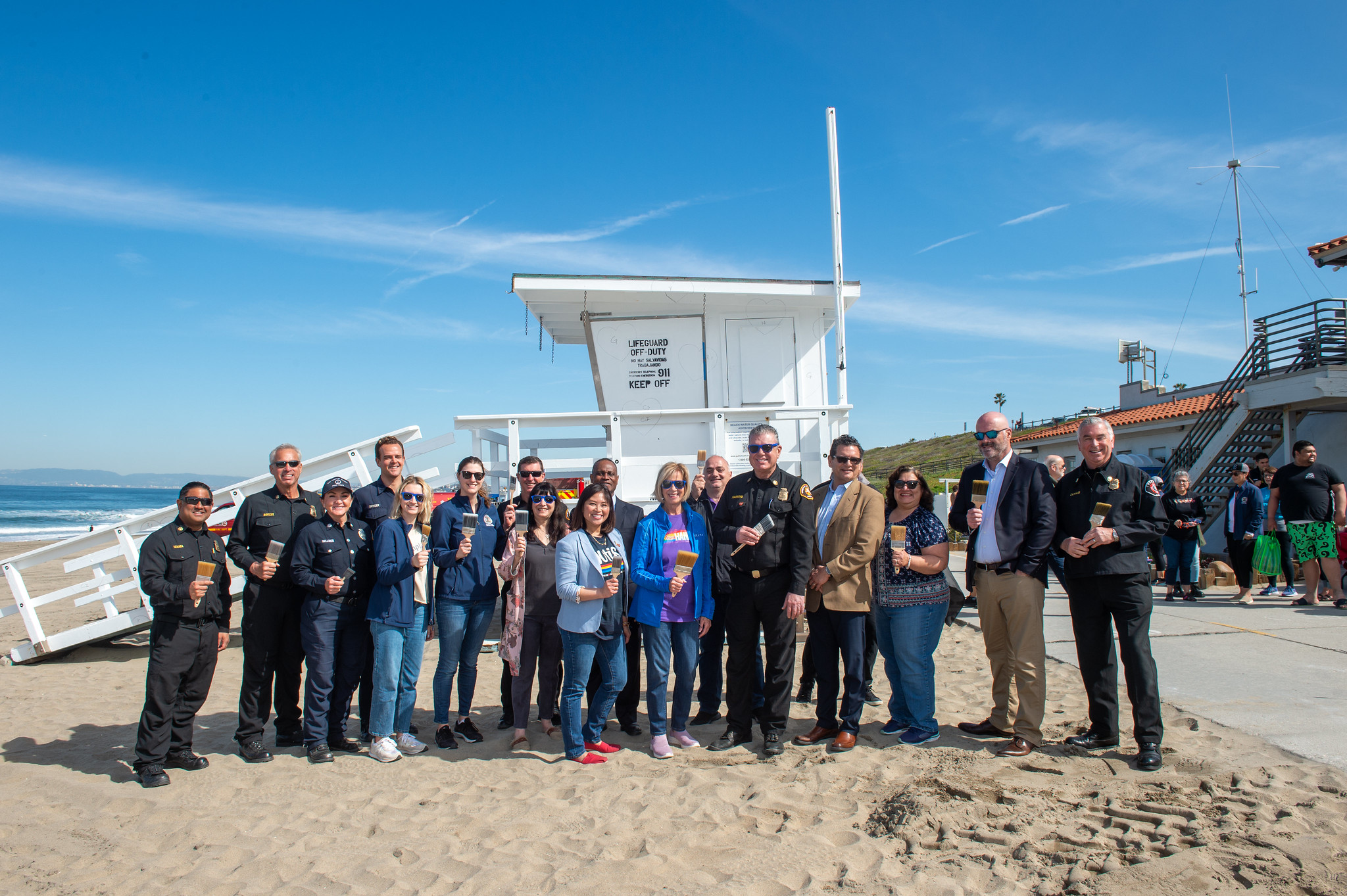 On March 27, 2023, Fourth District County Supervisor Janice Hahn, Fire Chief Anthony C. Marrone, Department of Beaches and Harbors Director Gary Jones, Ocean Lifeguard/Artist Scott Snyder, and Sirens of Silence Creator/LACoFD Communications Manager Karen Zarsadiaz-Ige, kicked-off the painting of a permanent Sirens of Silence lifeguard tower that is dedicated to promoting autism and special needs awareness and inclusion. Throughout the week, autism and special needs individuals and their families, therapists, educators, advocates, and community groups volunteered their time and effort to hand-paint the tower’s colorful mural (designed by OL Scott Snyder) which represents a flurry of vibrant hearts that exemplifies an exuberance of joy, love, and kindness while embracing all abilities.